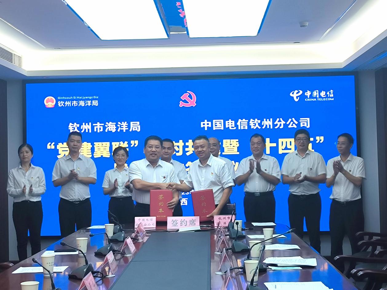 为全面贯彻党的二十大精神及中央经济工作会议精神,促进钦州市向海经济高质量发展,深入加强钦州市海洋局与中国电信钦州分公司的合作,为双方党建结对共建、共谋事业发展拉开一个崭新的序幕,2023年6月12日上午,钦州市海洋局与中国电信股份有限公司钦州分公司签订《“党建翼联”结对共建暨“十四五”战略合作协议》。市海洋局党组书记、局长闫松银,中国电信广西分公司党委书记、总经理罗东出席仪式并讲话。