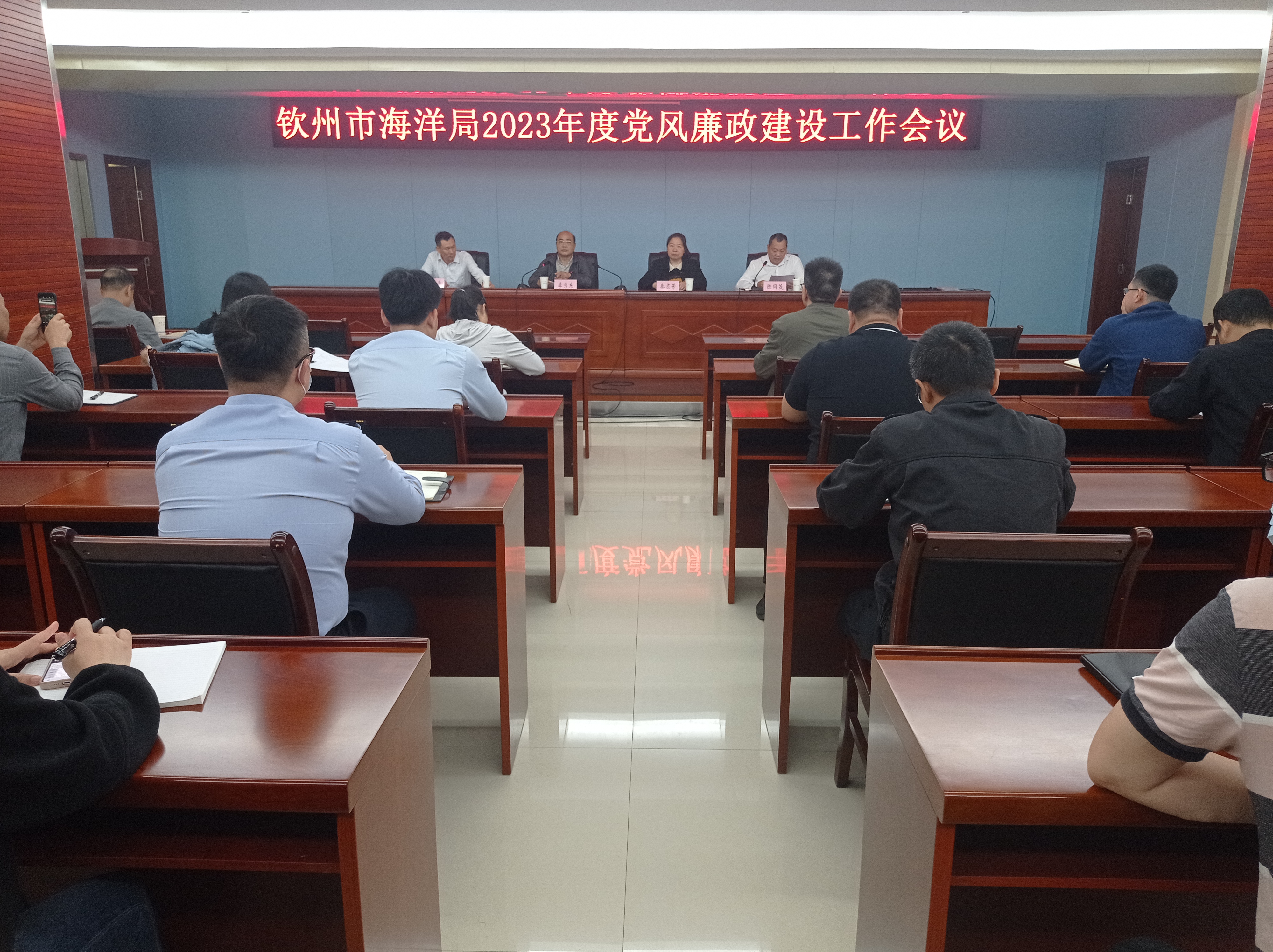 4月27日,市海洋局组织召开2023年全市海洋系统党风廉政建设工作会议,深入学习贯彻落实二十届中央纪委二次全会、自治区纪委十二届三次全会精神、市六届纪委三次全会精神,总结2022年度党风廉政建设工作,研究部署2023年工作任务。受局党组书记、局长闫松银委托,会议由局党组成员、副局长陈同茂作报告,市纪委监委驻市交通运输局纪检监察组组长秦志芳到会指导。